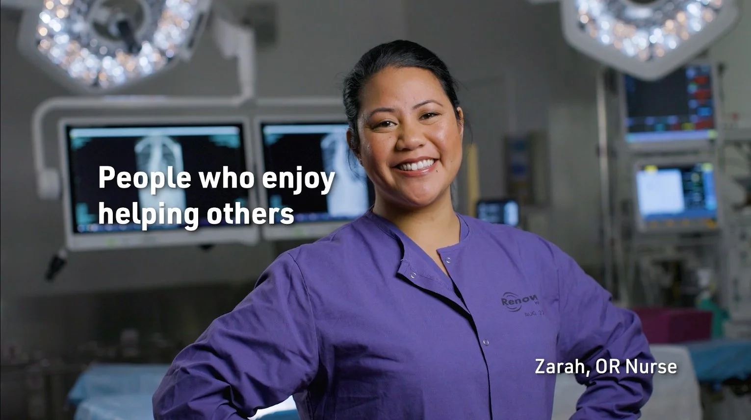 Highlighting the amazing people behind a brand can be a wonderful way to engage and help convince equally amazing people to join the team. This video became the centerpiece of the Renown careers landing page with messaging that also made its way across touchpoints near and far in a richly faceted and successful recruitment campaign.